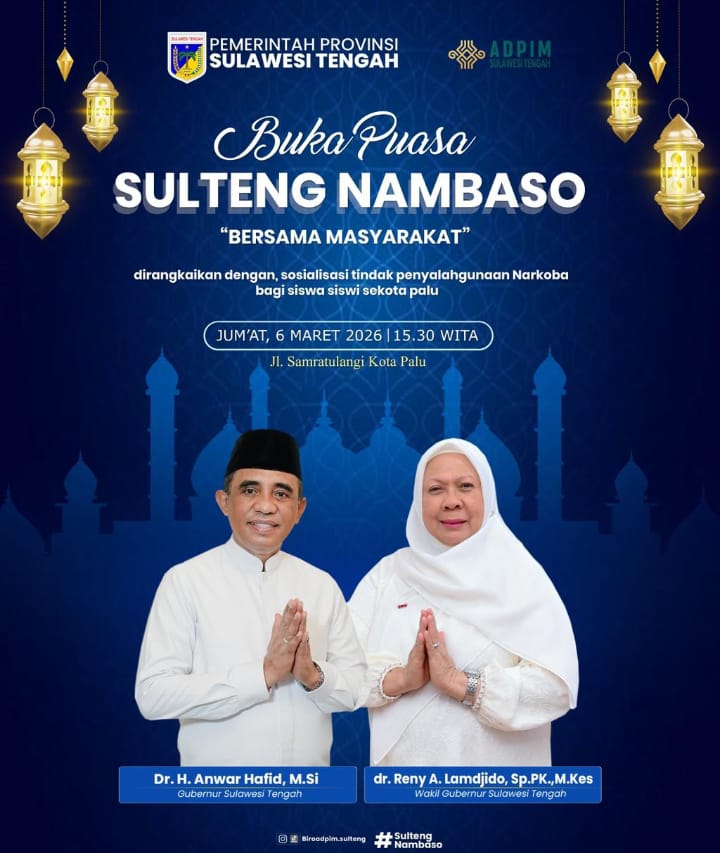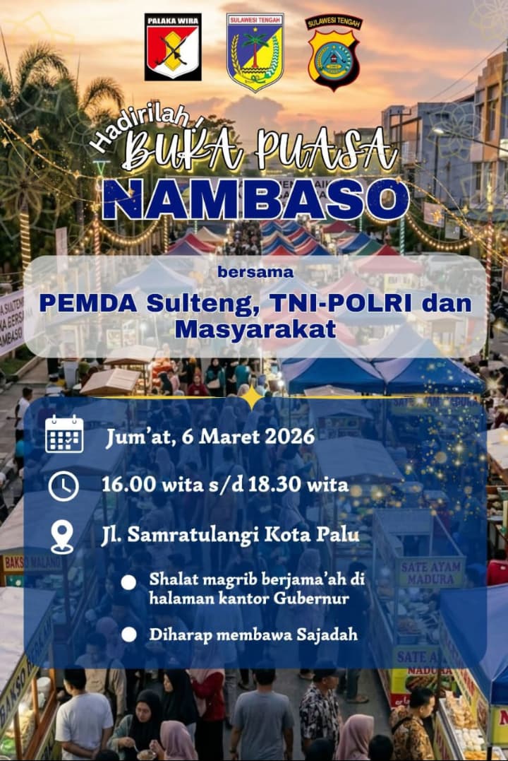 Pemerintah Provinsi Sulawesi Tengah Jum’at besok (6/3-2026) mengundang masyarakat Sulteng khusus warga kota Palu, Sigi, Donggala Parimo untuk menghadiri semarak Berani Buka Puasa Bersama (Bukber) Nambaso di sepanjang jalan Samratulangi tepatnya di halaman Kantor Gubernur Sulawesi Tengah, Kota Palu.