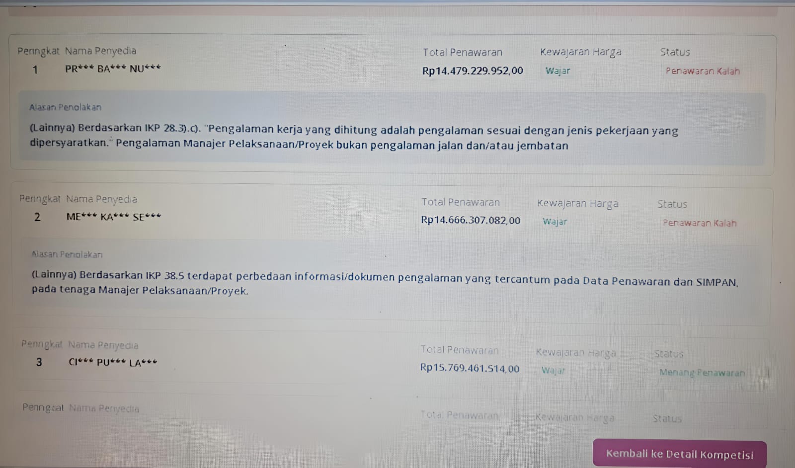 Pada akhirnya PT Citra Putera Laterang ditetapkan sebagai pemenang dengan nilai penawaran Rp15.769.461.514, yang justru merupakan penawaran tertinggi dari harga penawaran peserta lain dalam paket tender jembatan nasional tersebut.