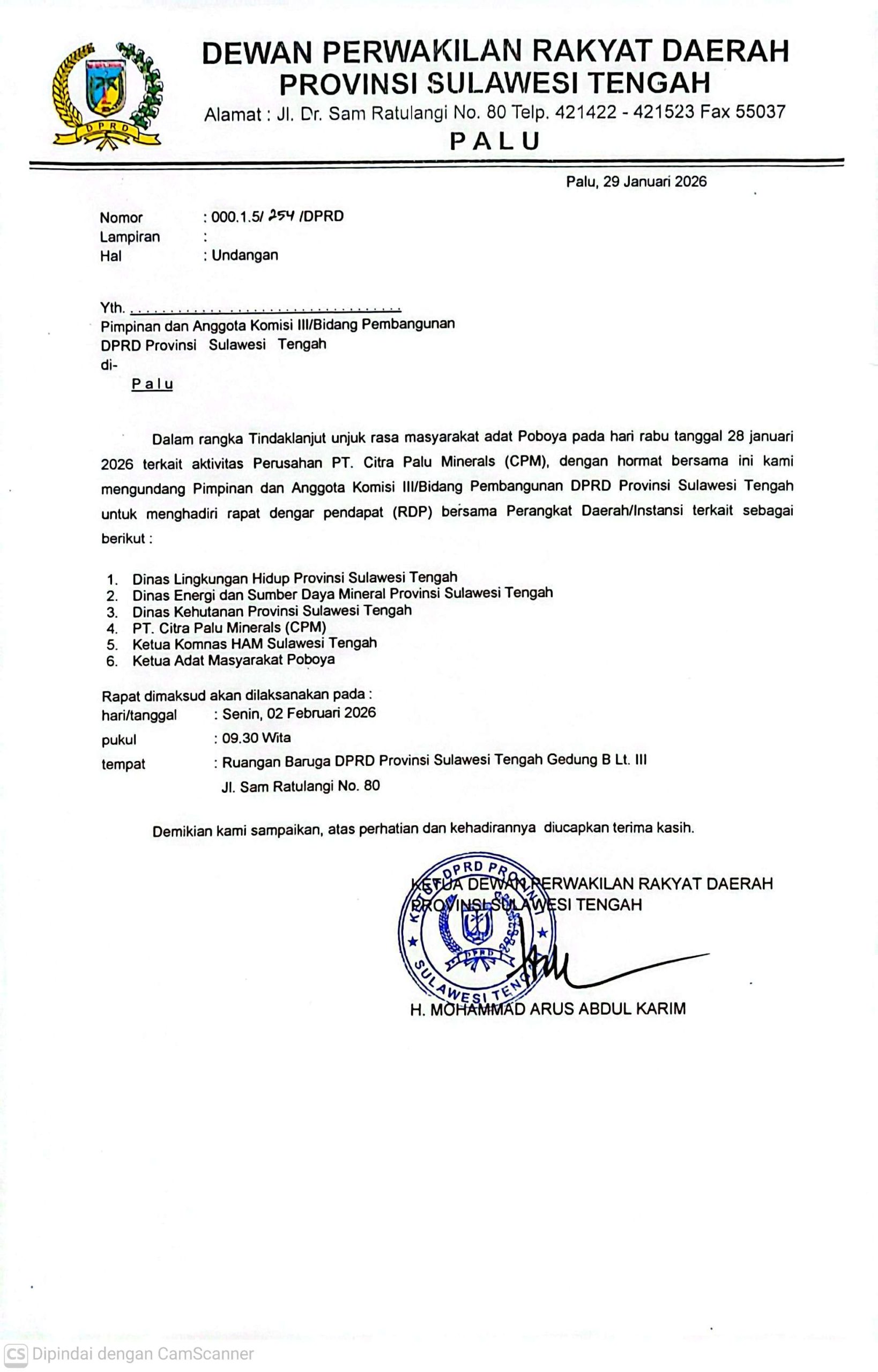 Agenda RDP tersebut tertuang dalam surat resmi DPRD Sulteng bernomor 000.1.5/254/DPRD yang ditandatangani Ketua DPRD Sulteng, H. Mohammad Arus Abdul Karim, tertanggal 29 Januari 2026.