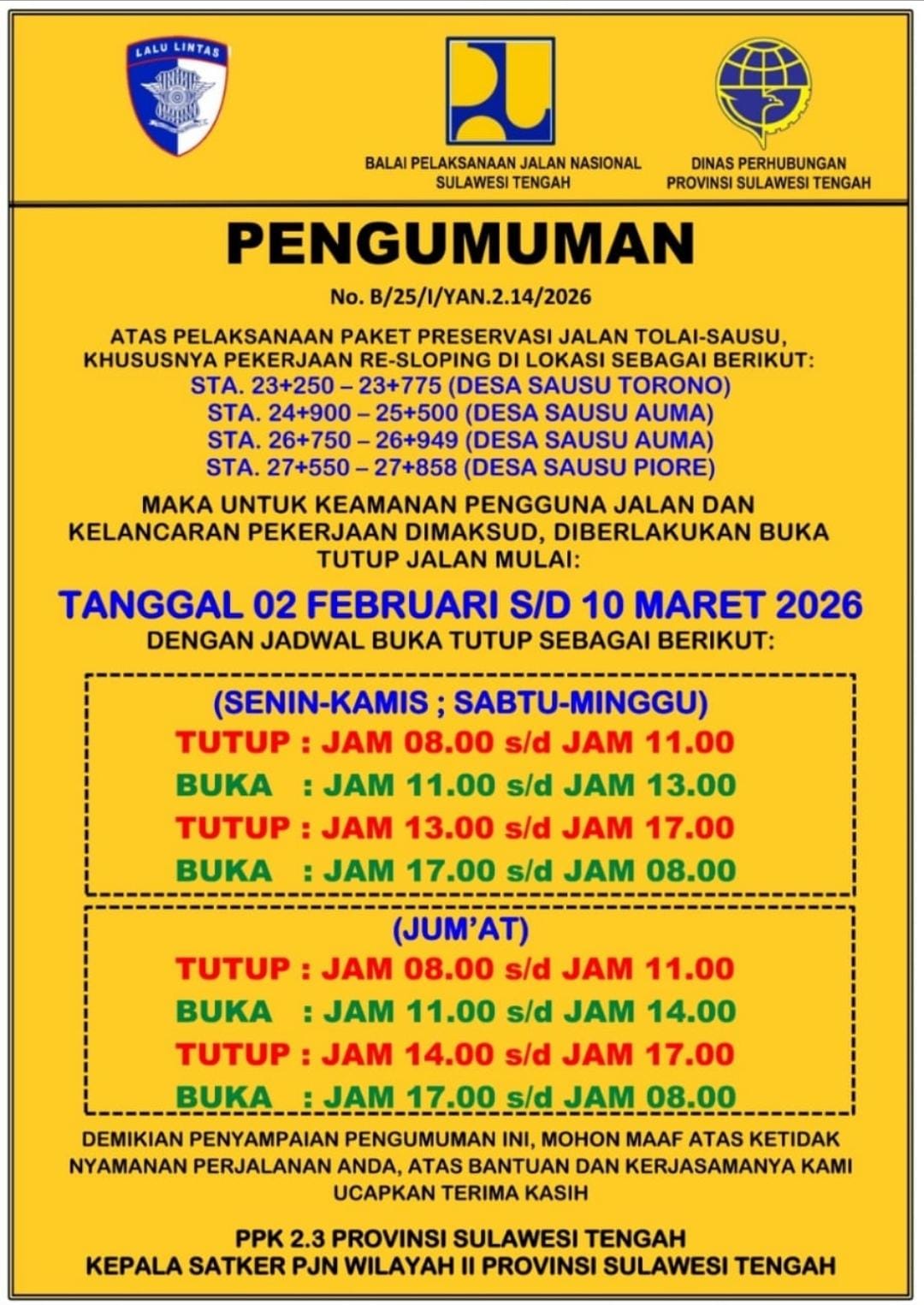 Parigi Moutong – Balai Pelaksanaan Jalan Nasional (BPJN) Sulawesi Tengah melalui PPK 2.3 Provinsi Sulawesi Tengah memberlakukan rekayasa lalu lintas berupa buka tutup jalan pada ruas Tolai–Sausu. Kebijakan ini dilakukan seiring pelaksanaan paket preservasi jalan, khususnya pekerjaan re-sloping pada sejumlah titik di wilayah Desa Sausu.